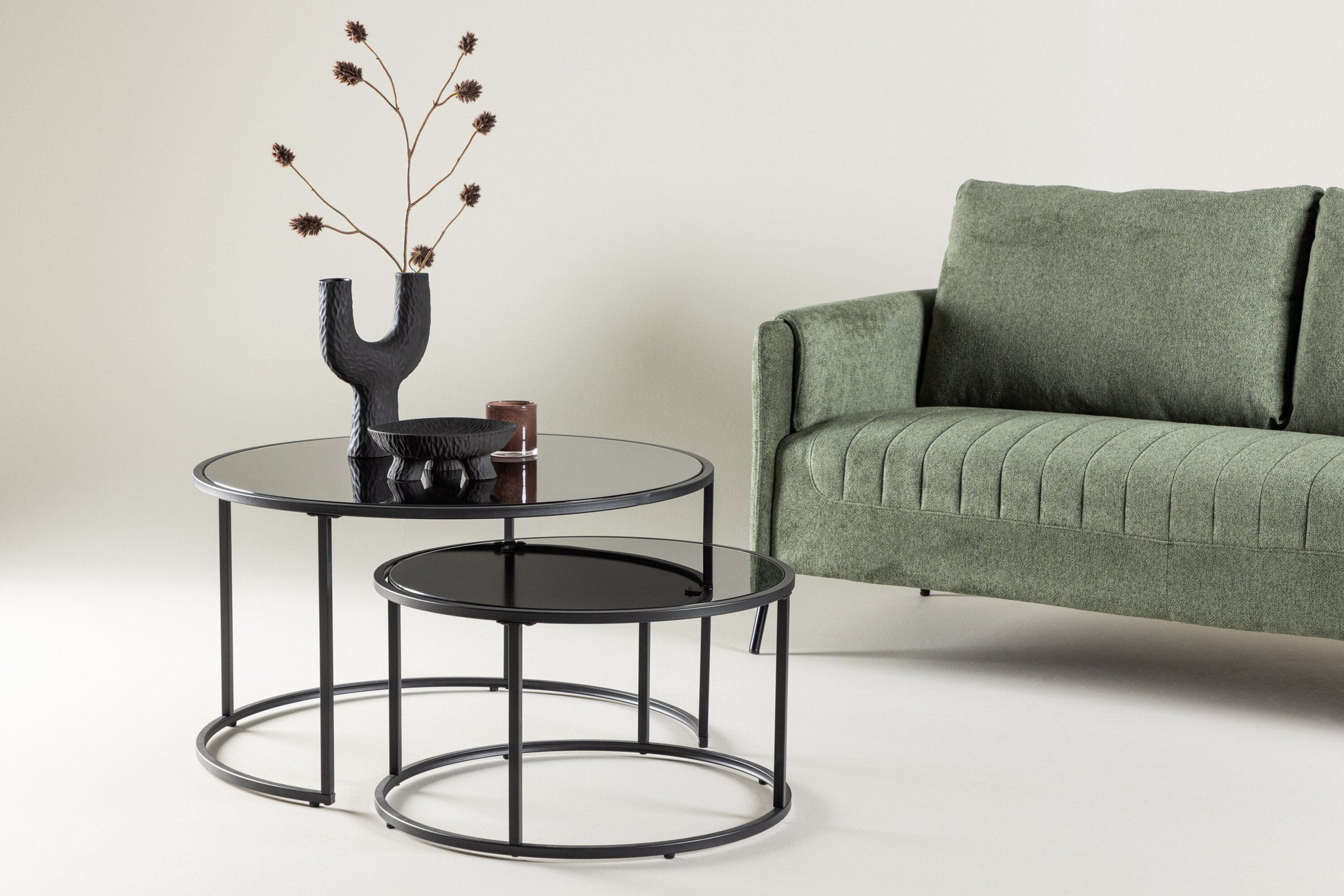 Die Tischplatten aus schwarzem Glas und die Beine aus Stahl verleihen dem Set eine moderne und elegante Optik. Twin überzeugt mit einem harmonischen Design, das sich perfekt in verschiedene Einrichtungsstile einfügt.