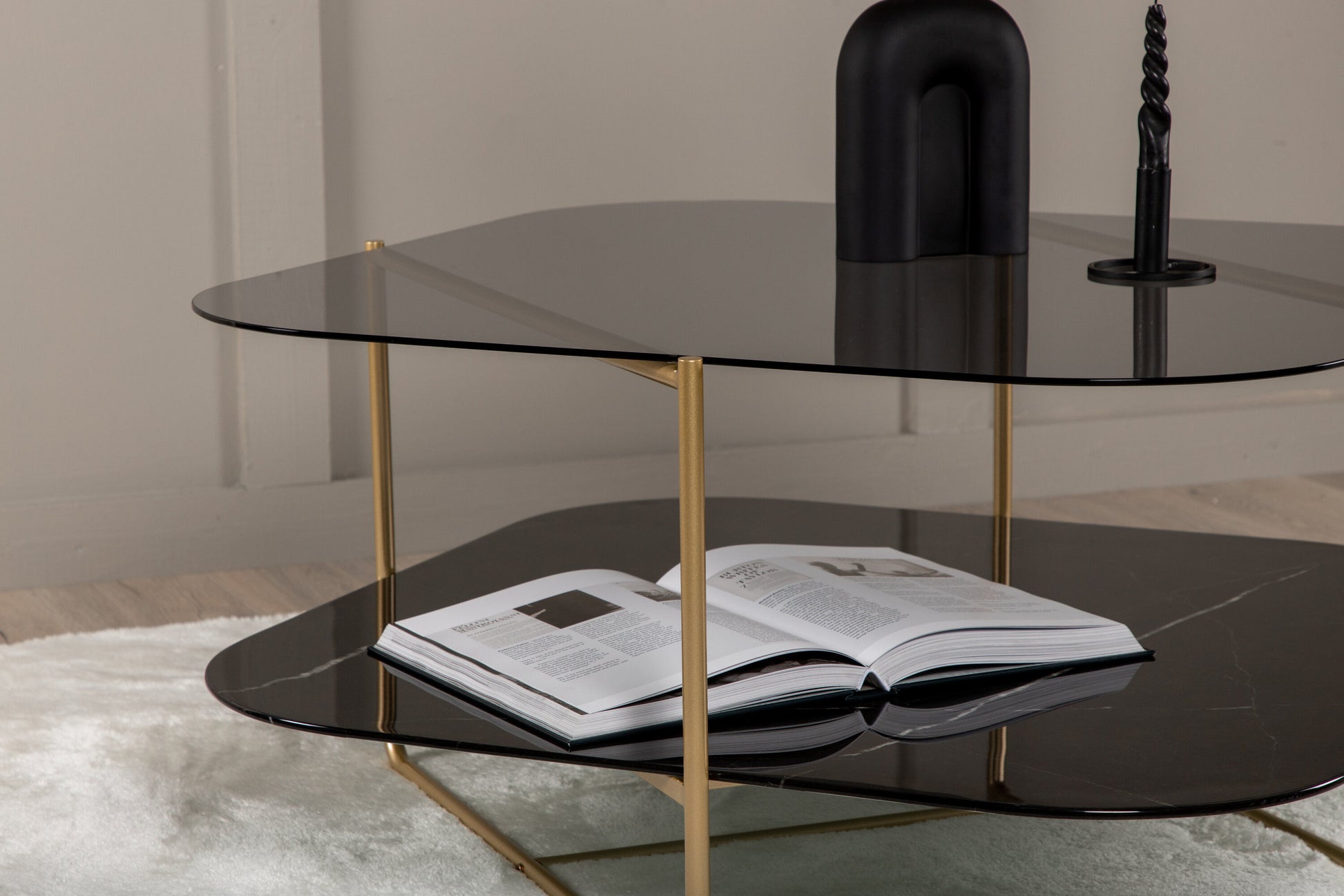 Mit seinem modernen Design und der schlanken Linienführung wird dieser Couchtisch aus der UN-Line Serie zum Highlight in jedem Wohnzimmer. Das geradlinige Gestell aus goldfarbenem Metall und die elegante Tischplatte aus rauchschwarzem Glas verleihen ihm eine minimalistische Eleganz. Die darunter liegende Ablagefläche in schwarzer Marmoroptik verbindet praktische Funktionalität mit ästhetischer Raffinesse.