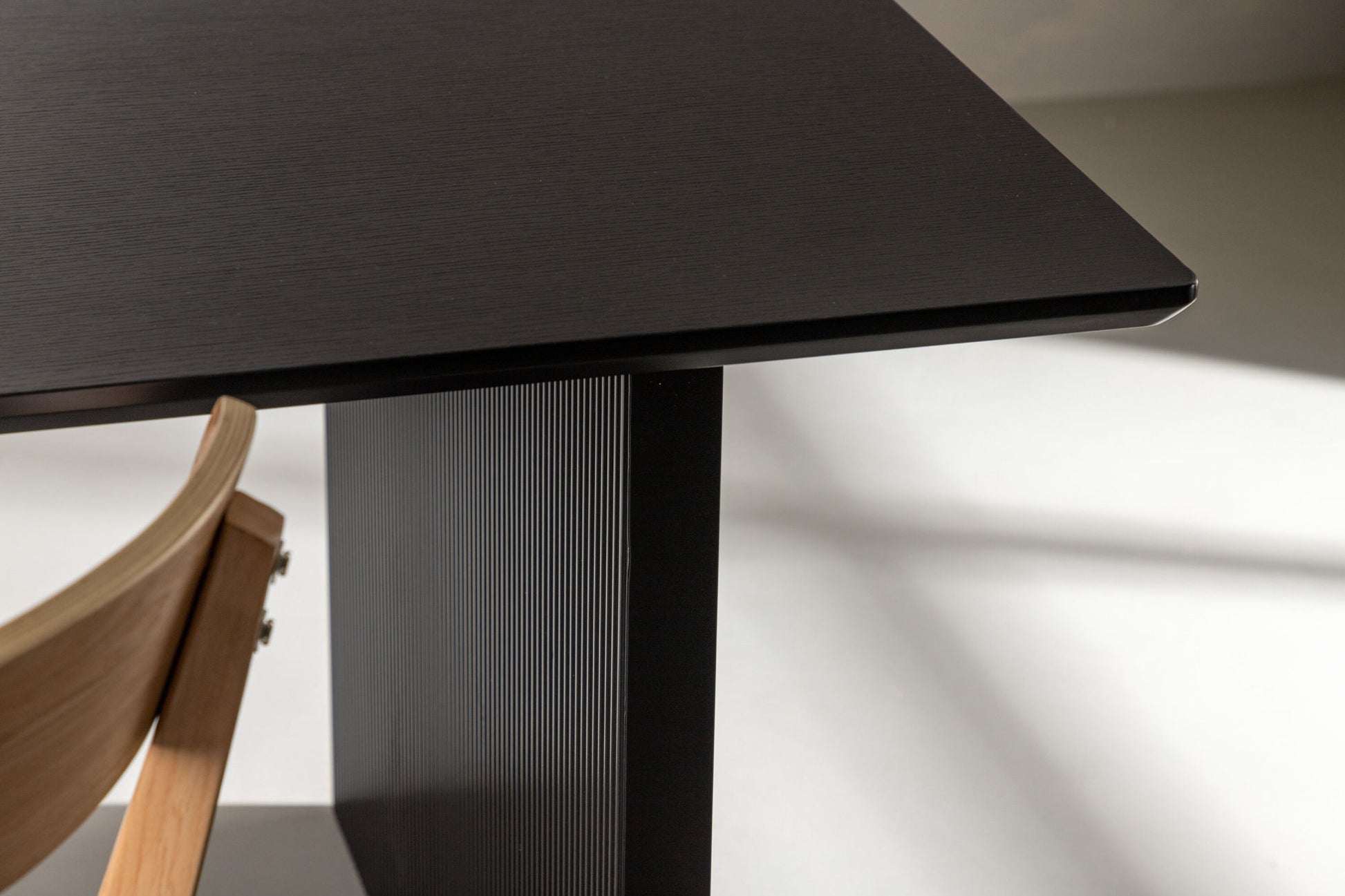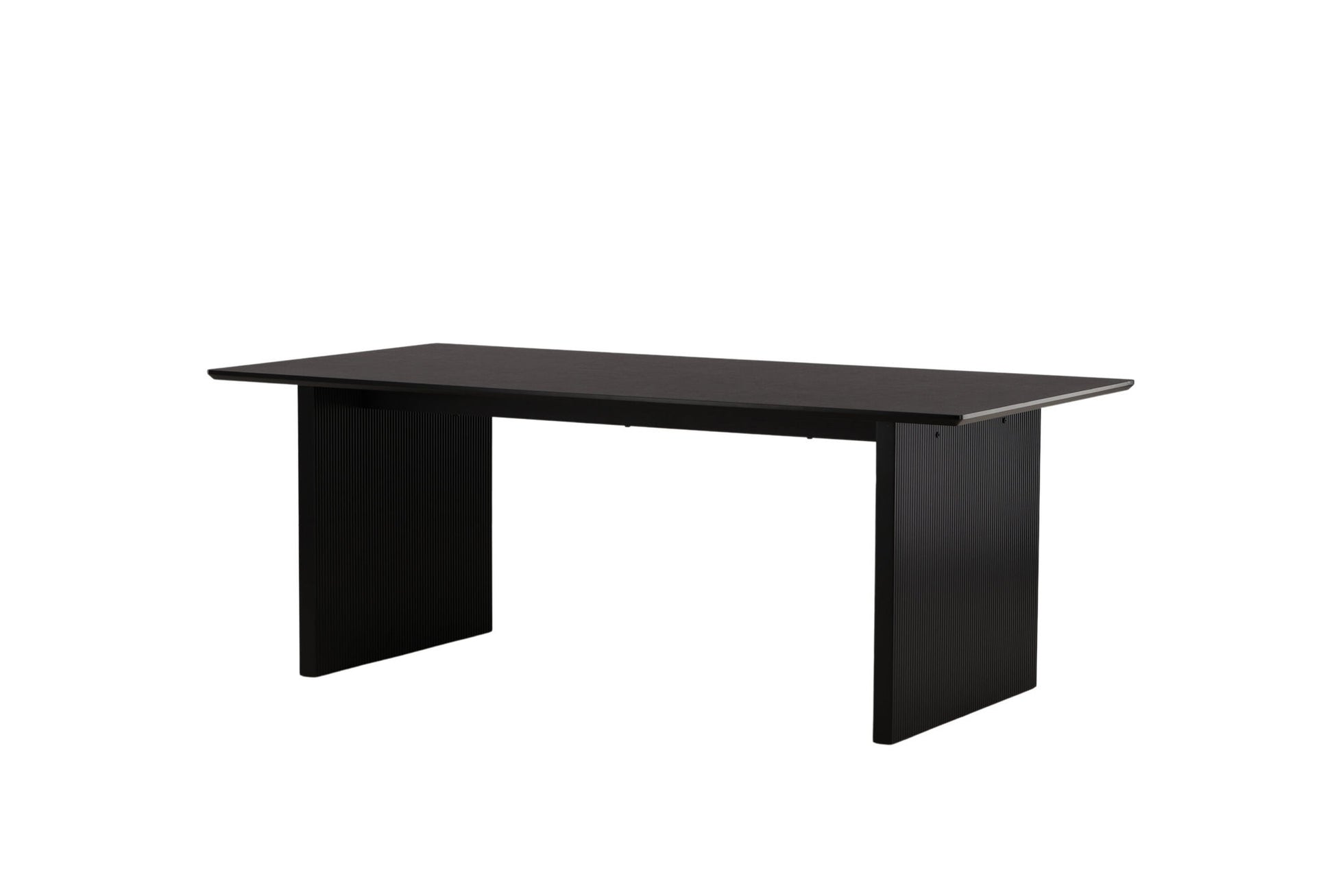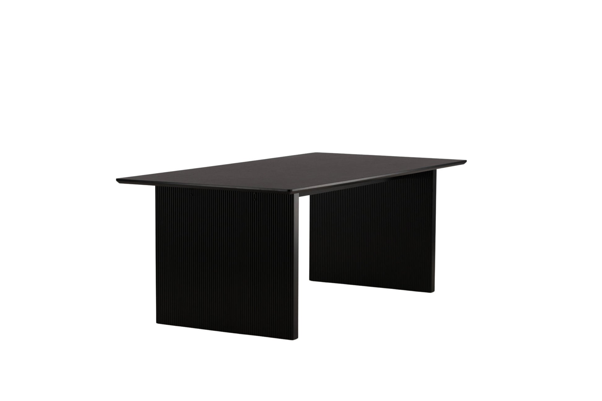 Der Vail Esstisch kombiniert eine rechteckige Tischplatte in schwarzer Holzoptik mit einem stabilen, geradlinigen Untergestell, das für eine klare, moderne Ästhetik sorgt. Die durchgehende Konstruktion bietet einen sicheren Stand und fügt sich harmonisch in verschiedene Wohnkonzepte ein.
