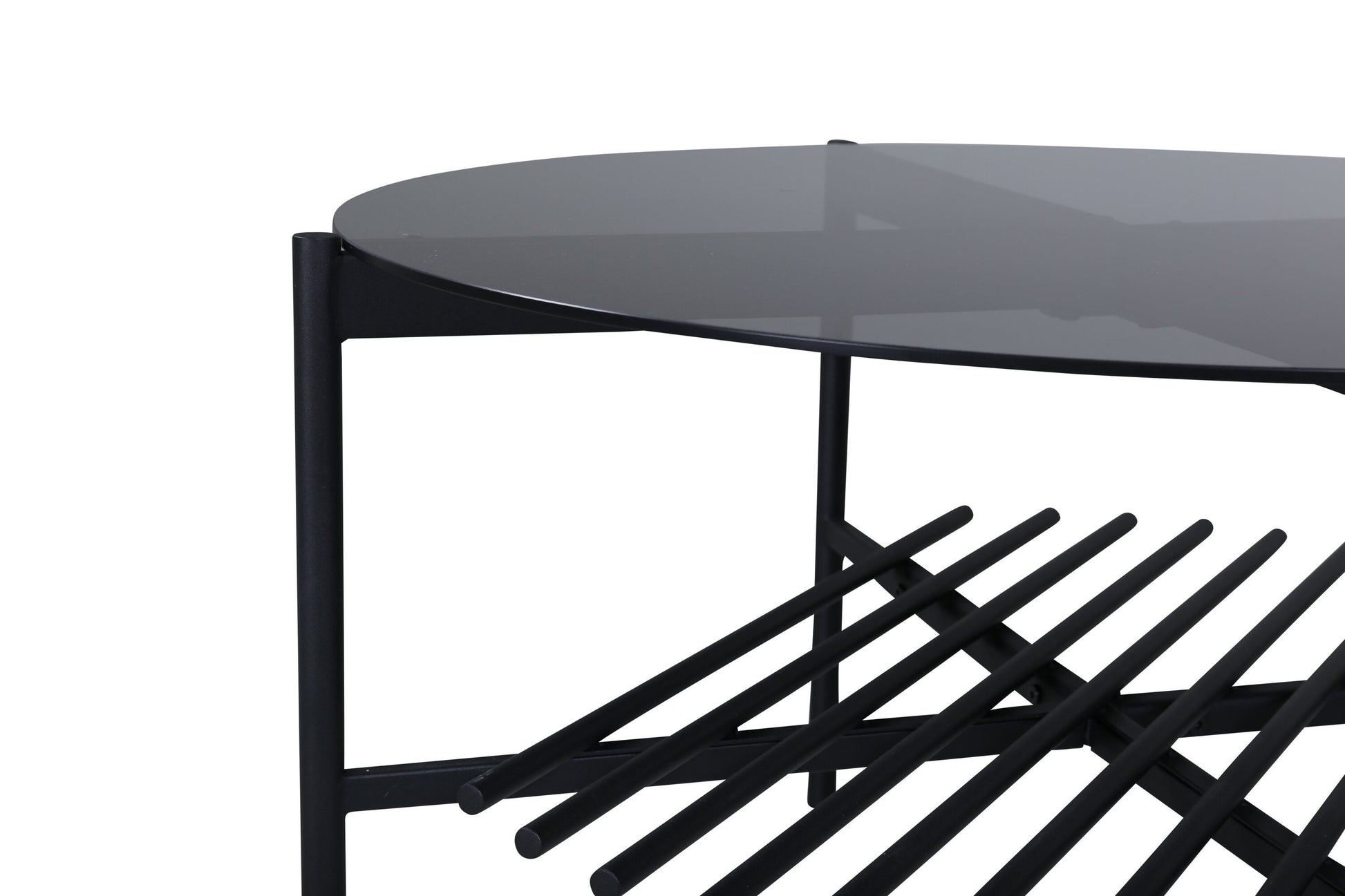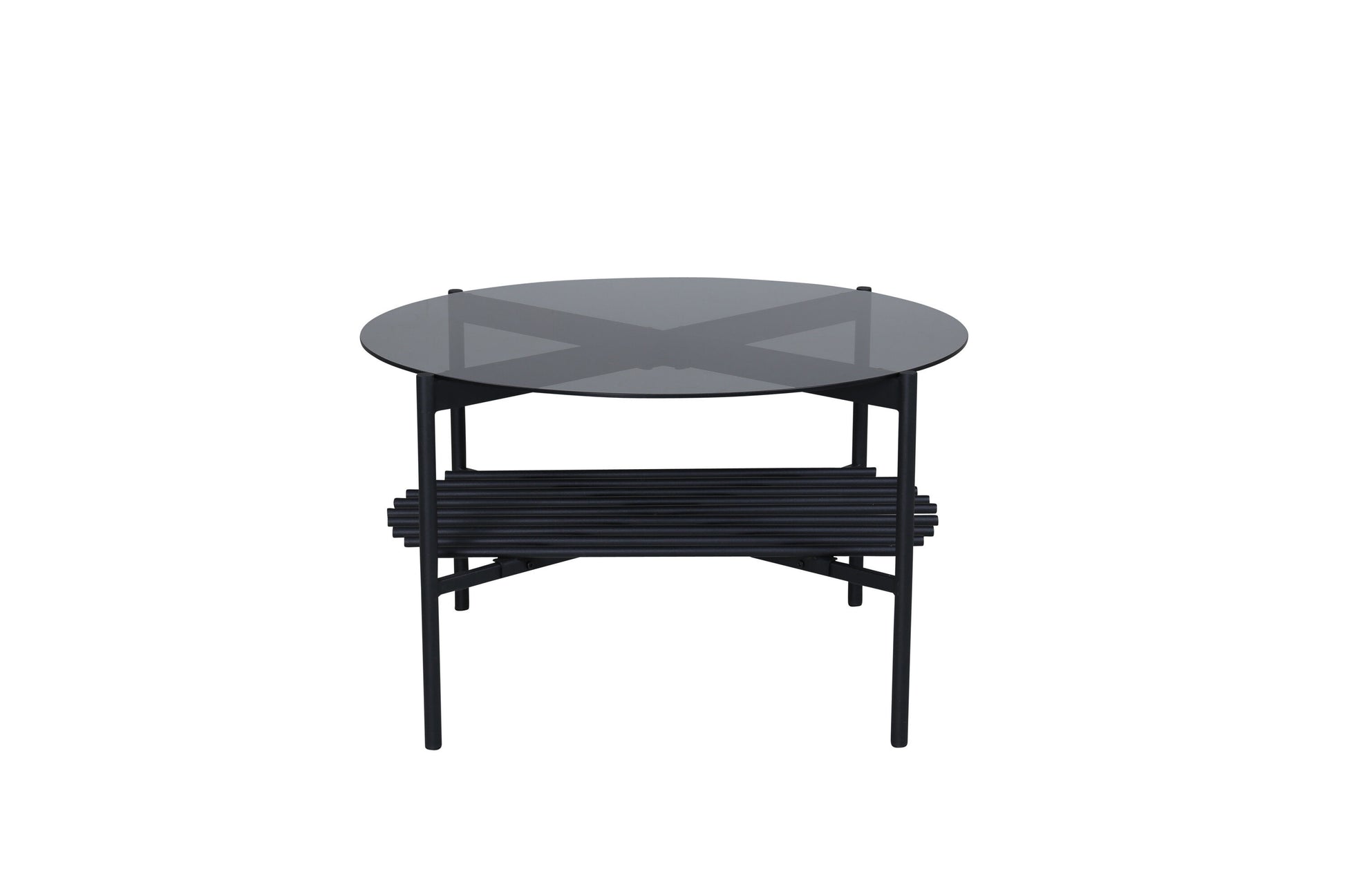 Der Couchtisch aus der Serie Von Staf verbindet modernes Design mit industriellen Akzenten. Die runde Tischplatte aus rauchschwarzem Glas harmoniert mit dem dekorativen Gestell aus schwarzem Metall und verleiht dem Wohnraum eine stilvolle Note. Eine zusätzliche Ablage im industriellen Look bietet Platz für dekorative Elemente oder praktischen Stauraum.